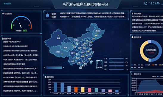 數據大屏是一款基于大屏的綜合性輿情數據分析系統,通過(guò)豐富的可視化窗口展現輿情走勢以及重點(diǎn)事件專(zhuān)項分析結果,多用于輿情會(huì )商和輔助決策。